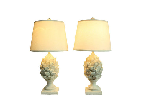 Original price $149.99Original price $149.99 - Original price $149.99Original price $149.99Current price $99.99$99.99 - $99.99Current price $99.99| /Set of matching table lamps; includes 2 artichoke-shaped lamp bases in weathered white, 2 7 1/2" harps in nickel finish, 2 finials in weathered wh...